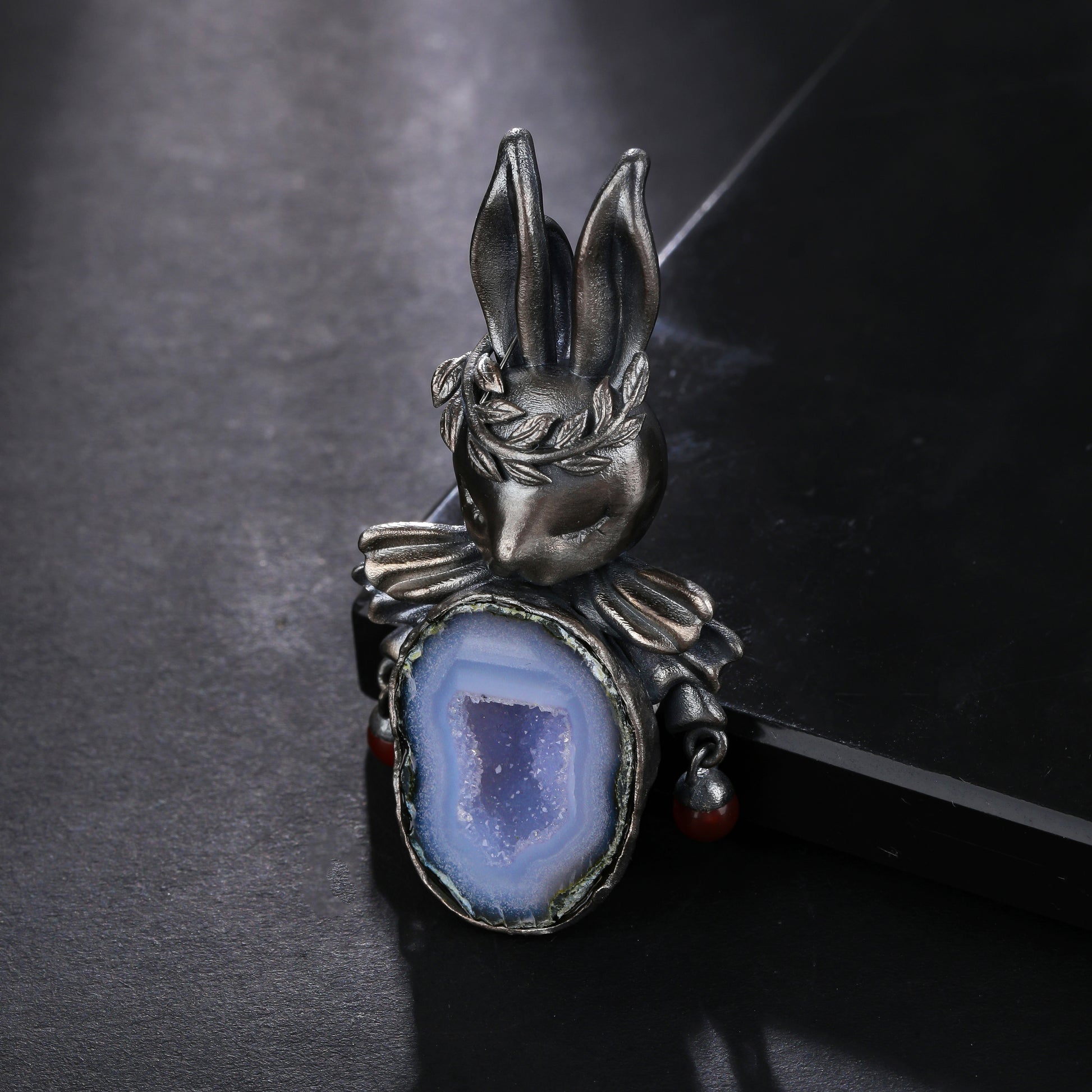 Carefully crafted from high-quality silver, this pendant features a combination of Silver-Geode and Red Agate, adding a touch of mystique and elegance. The Silver-Geode, with its mesmerizing patterns and organic formations, creates a stunning backdrop for the intricate design of the Magic Rabbit. The deep hues of the Red Agate complement the silver perfectly, enhancing the overall allure of the pendant.